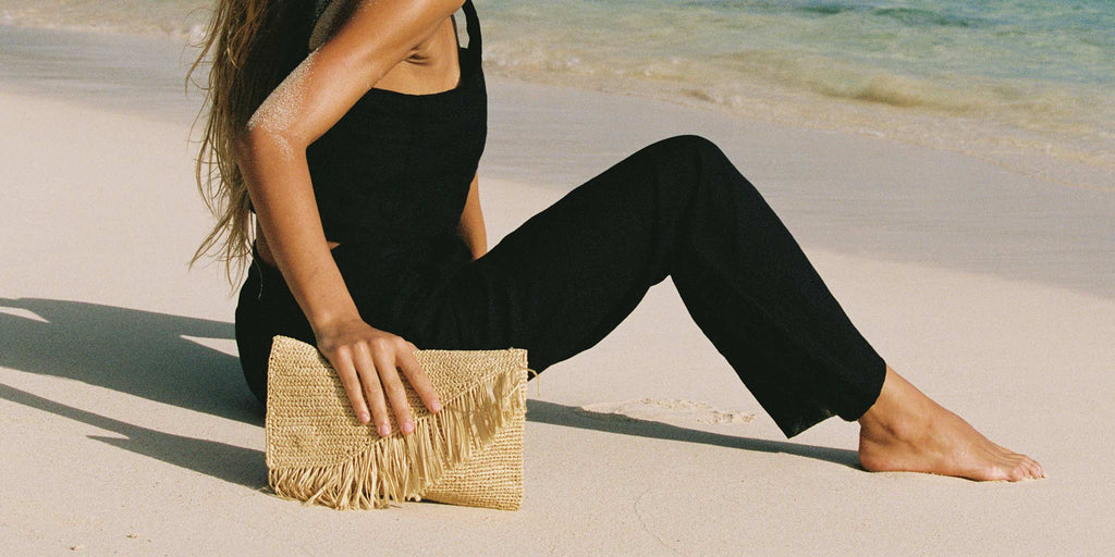 Complete your beach look with Vitamin A’s collection of sustainable accessories. Our raffia totes are equal parts stylish and functional, ideal for sunny days on the go. Pair them with a breezy sarong or a statement-making bucket hat to elevate your coastal outfit. Every piece is thoughtfully crafted to blend timeless design with easygoing charm. From the sand to the street, these accessories make summer dressing feel effortless.