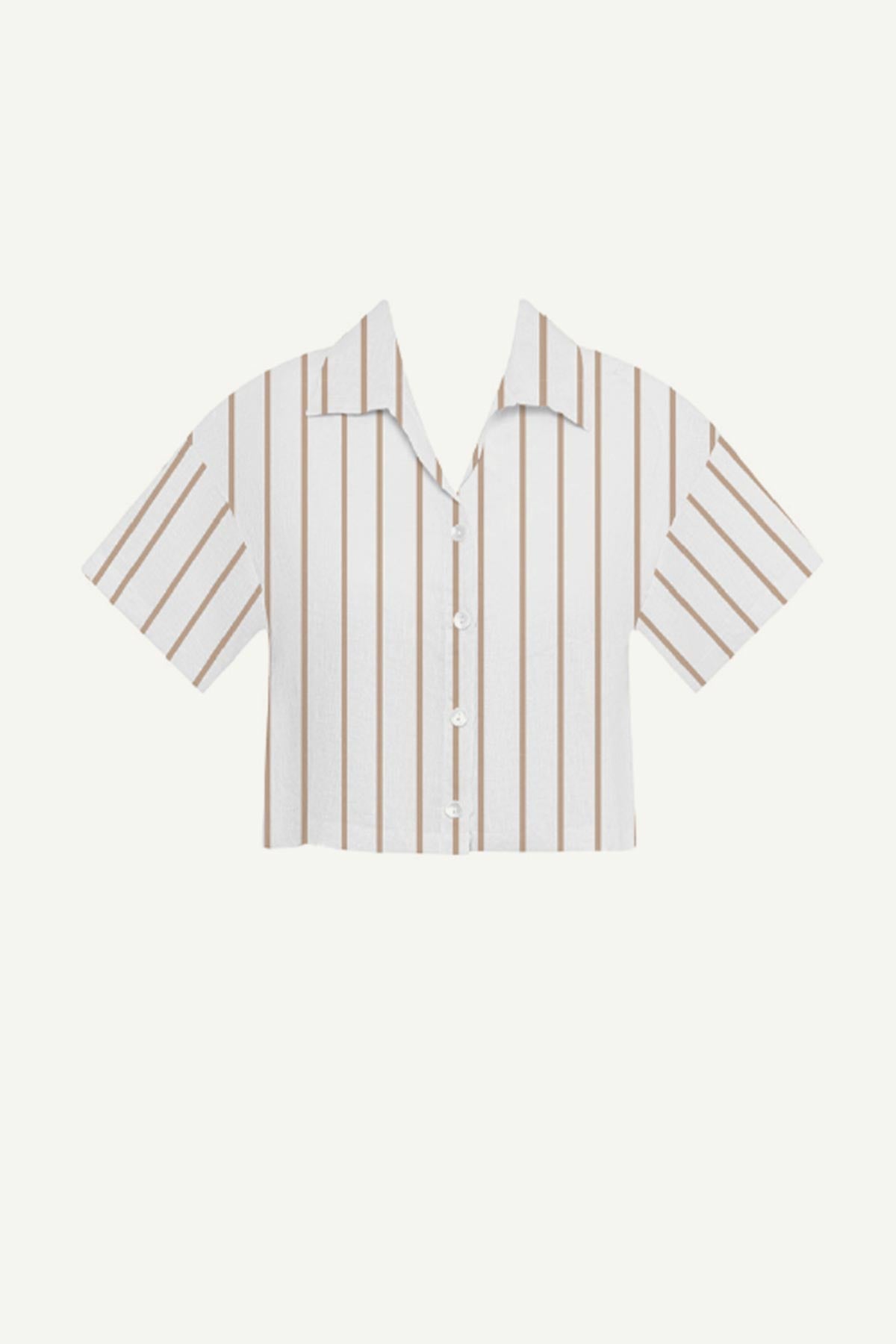 A versatile cropped button-down beachwear top with a boxy fit, shell buttons at the front, and a classic collar.