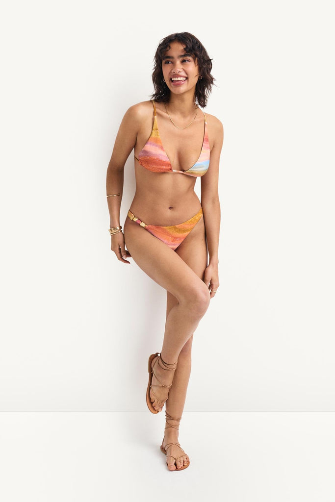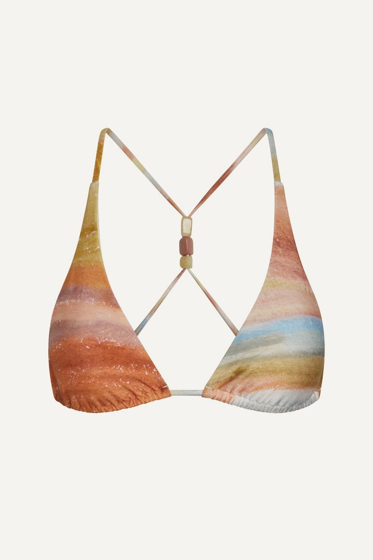 The Terra Halter Triangle Top features a classic triangle silhouette with ties at the back for a customizable fit. Recycled resin beads add a unique accent at the back, while removable cups offer optional coverage.