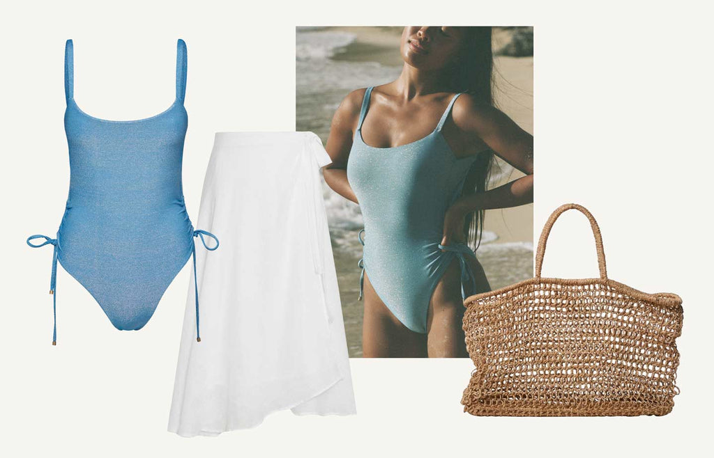 Pair the Gemma One Piece in Ocean Metallic + The Lana Skirt in White EcoLinen with our Allegra Net Bag.