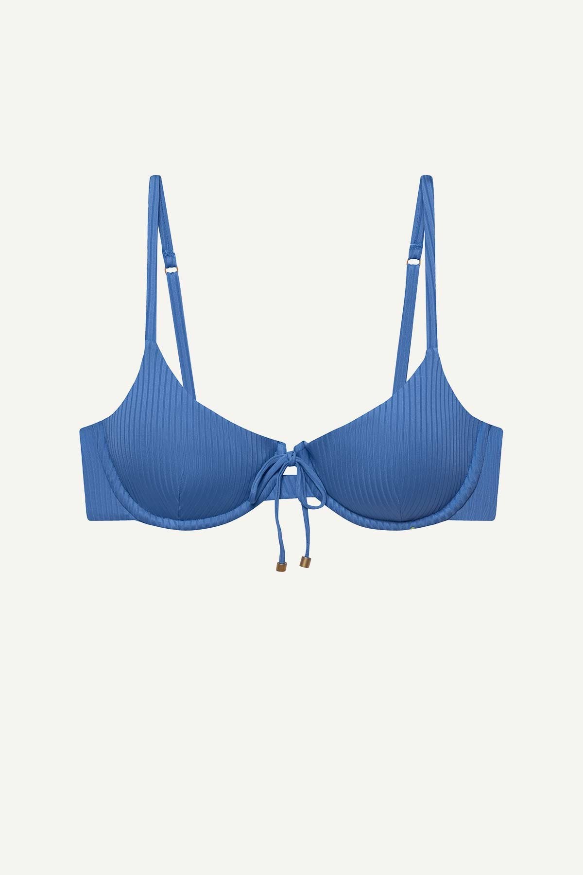 A chic, feminine bralette bikini top, Ada features an underwire for added support, an adjustable tie back, over-the-shoulder adjustable straps, darts for shape and a delicate center front tie detail.