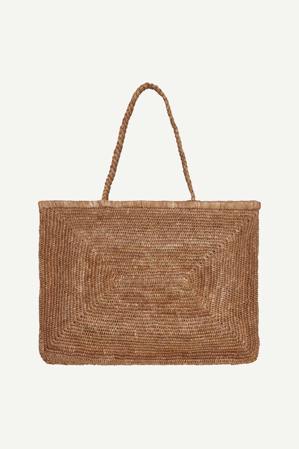 This 100% natural raffia bag is dyed using vegetable dyes. The Caramel color is created with a mixture of turmeric and yellow onion.