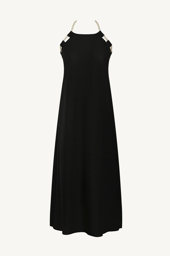 A full-length, detail-oriented maxi dress features cotton rope trim with wooden bead detail, darts at the bust for shape, and side seam pockets.