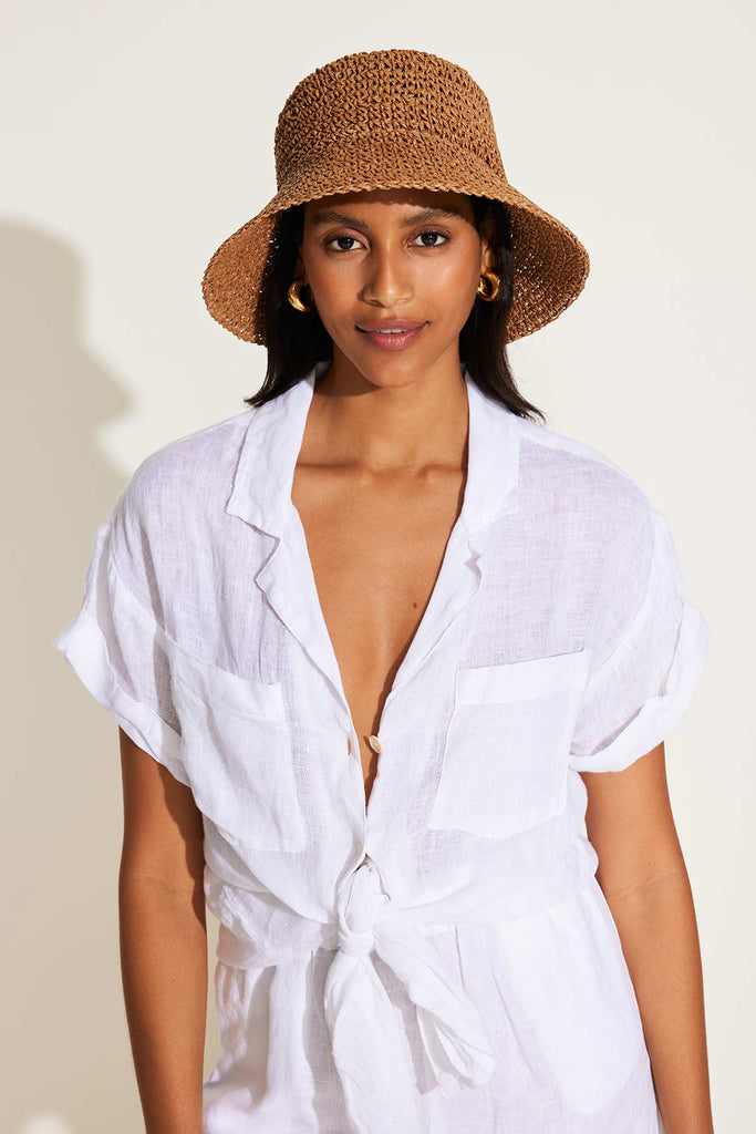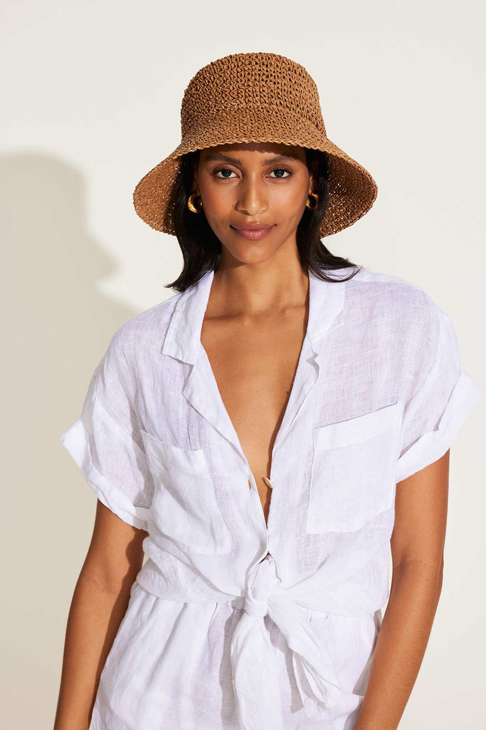 Tailor-made for sunny days, this chic, hand-woven bucket hat is crafted from straw.