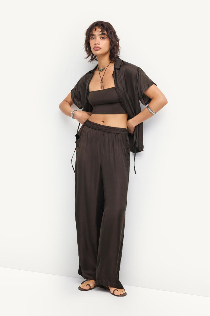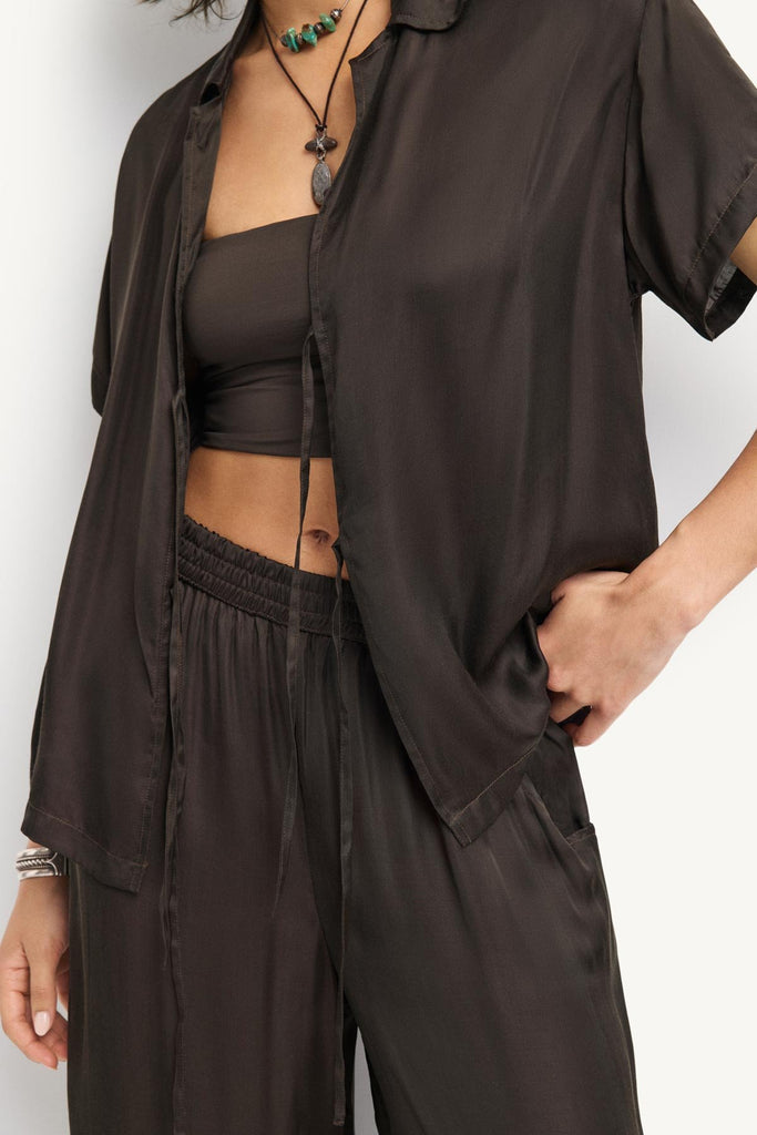 The Kami Pant offers a soft, silky handfeel with a subtle shimmer in a rich Deep Earth hue. Designed with an elastic waistband for an easy fit and side seam pockets for practicality, it pairs perfectly with the Kami Shirt or can be worn over a Deep Earth bikini for an effortless, coordinated look.