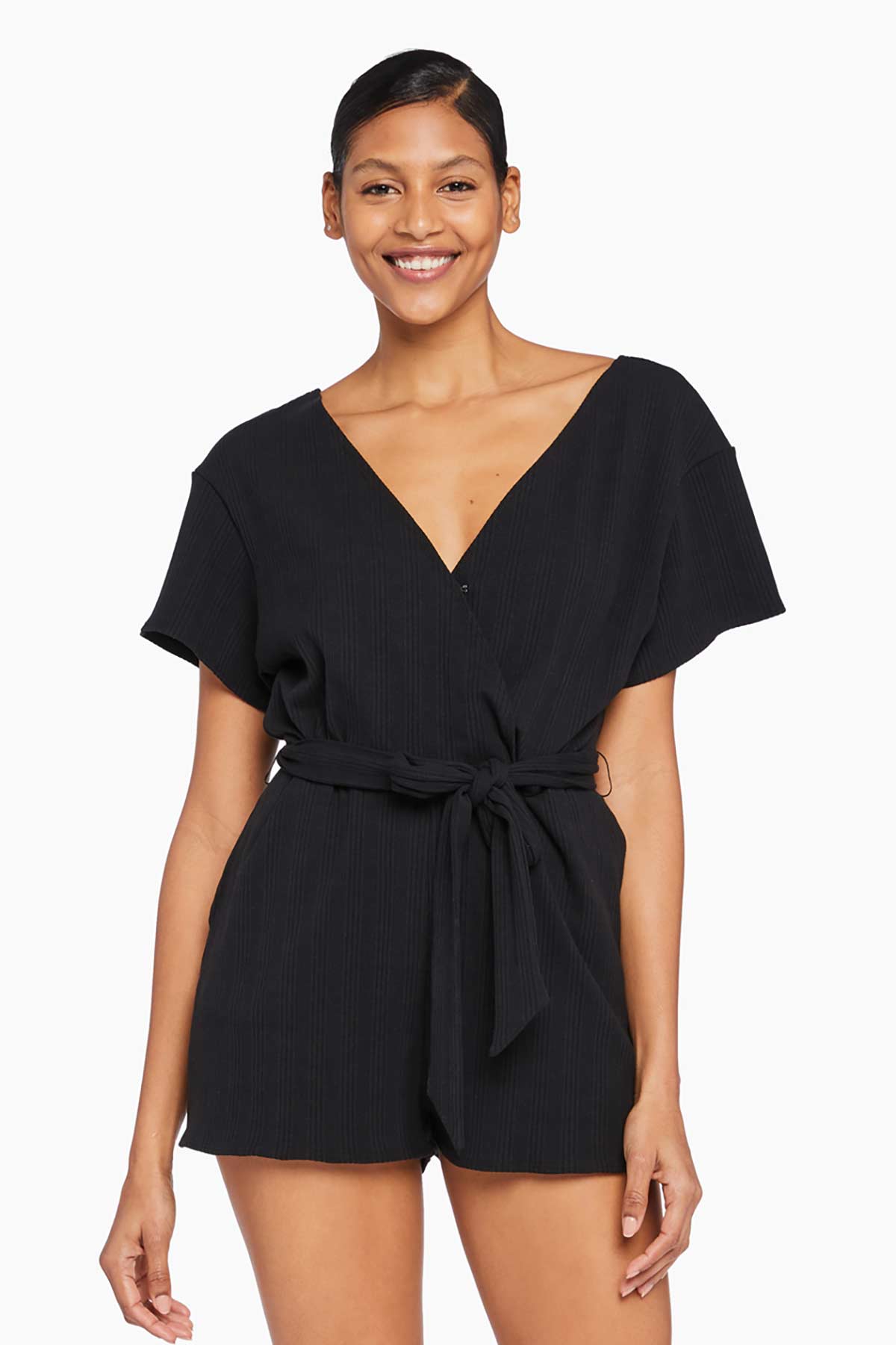 Goes on easy. A flowy romper with an adjustable tie at the waist.
