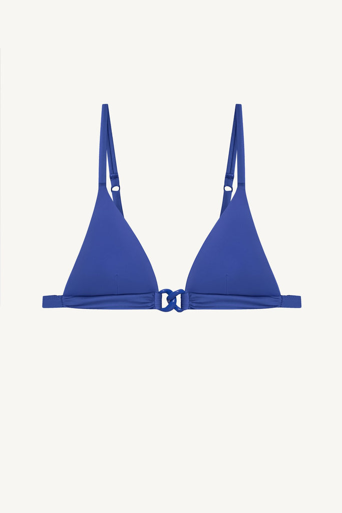 More is more. Meet Luxe Link, an elevated bralette bikini top with a triangle cut, adjustable over the shoulder straps + back closure, a standout matte hardware detail in the front, and removable cups.
