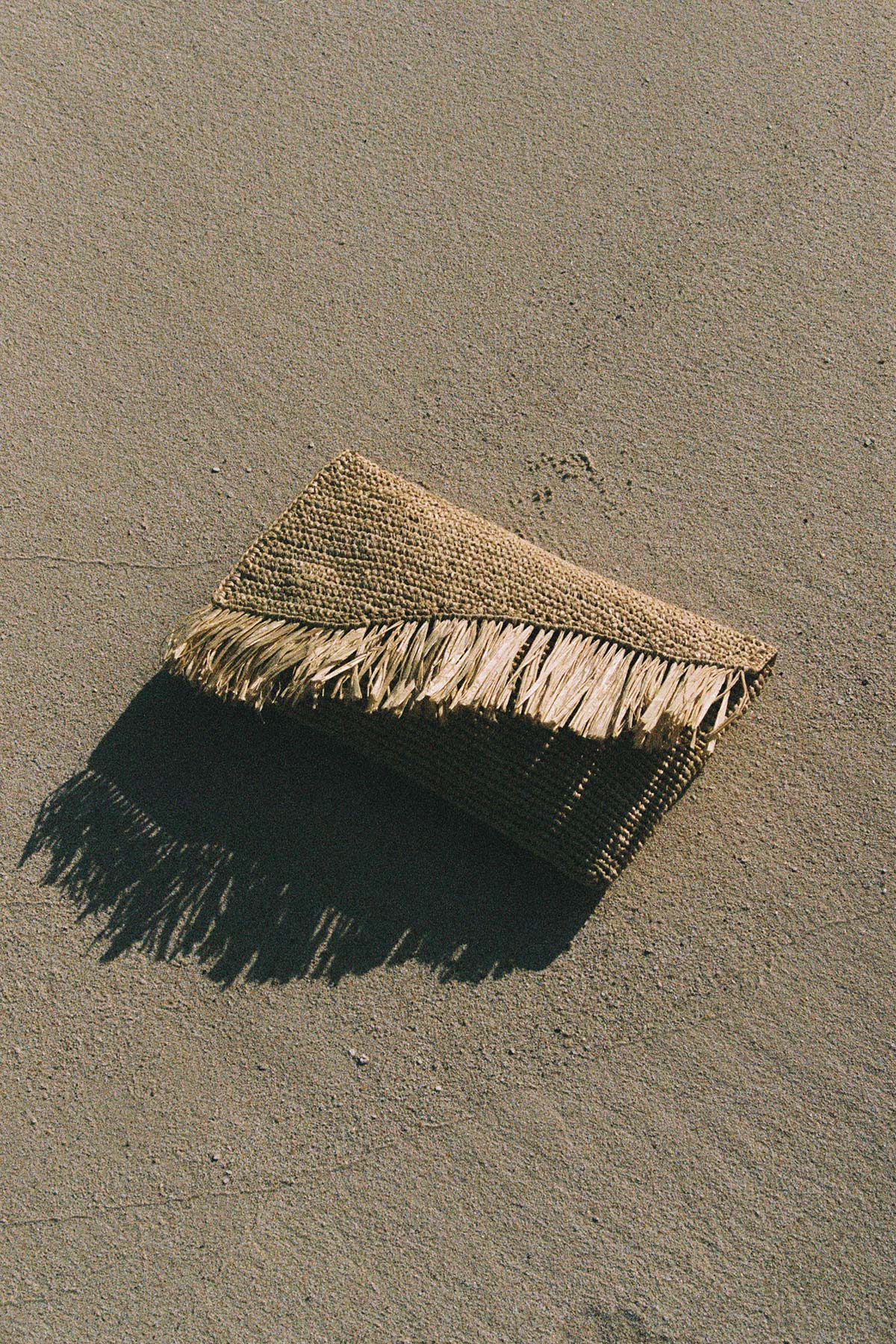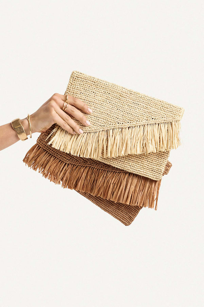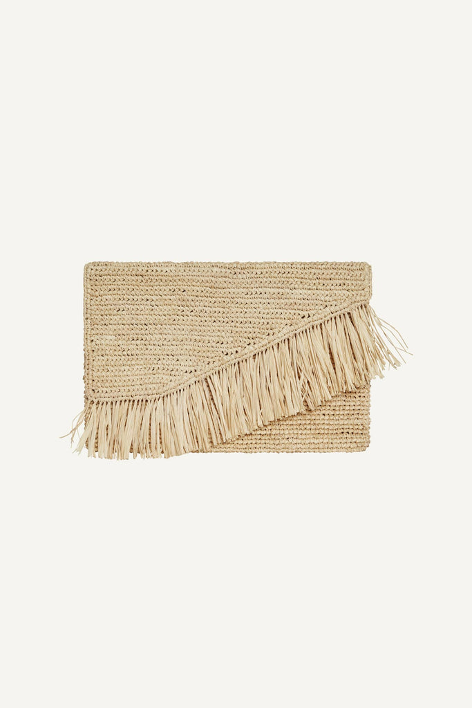 A laid back statement to top off any look. Handmade by local women artisans in Madagascar from raffia, a 100% natural and biodegradable fiber, this finely woven pouch fits all your essentials in hand, with a fringe-trimmed flap and a magnetic clasp to keep them safe.