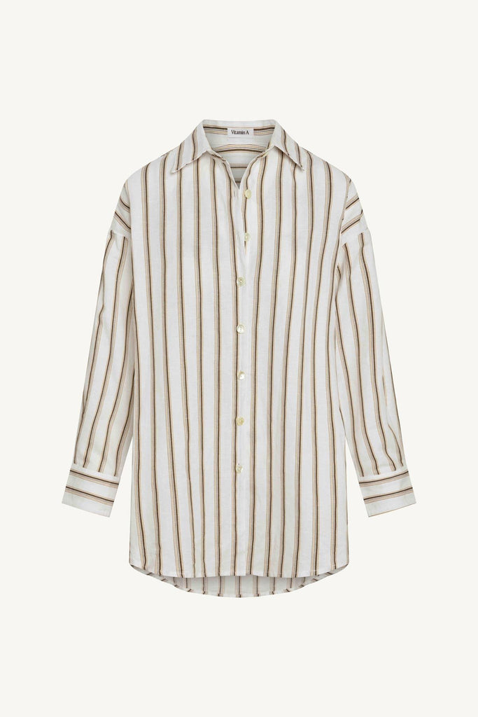 Designed for effortless style on the go, our best-selling Playa Boyfriend Shirt is a travel essential you’ll reach for time and again. Earth Stripe is crafted from a breathable organic cotton-linen blend with a light handfeel, it features a yarn-dyed stripe in Deep Earth. The classic button-front, collared design is finished with refined shell buttons for a polished touch, while its oversized fit makes it perfect as a breezy cover-up. We especially love it layered over a solid Deep Earth bikini, paired with denim, or styled with our customer favorite, The Getaway Short—making packing light, easy, and stylish.