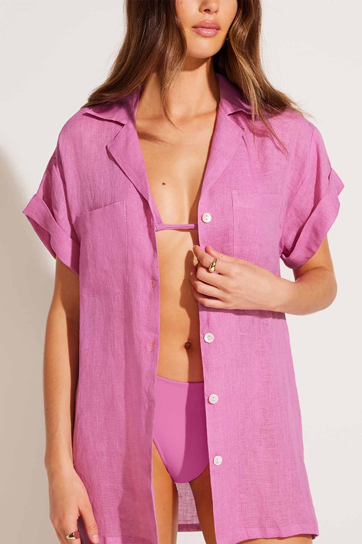 The Playa Oversized Shirt gets an update with the leveled-up Playa Pocket Blouse, a feminine linen button down shirt that's perfect for the beach—and aprés swim too.