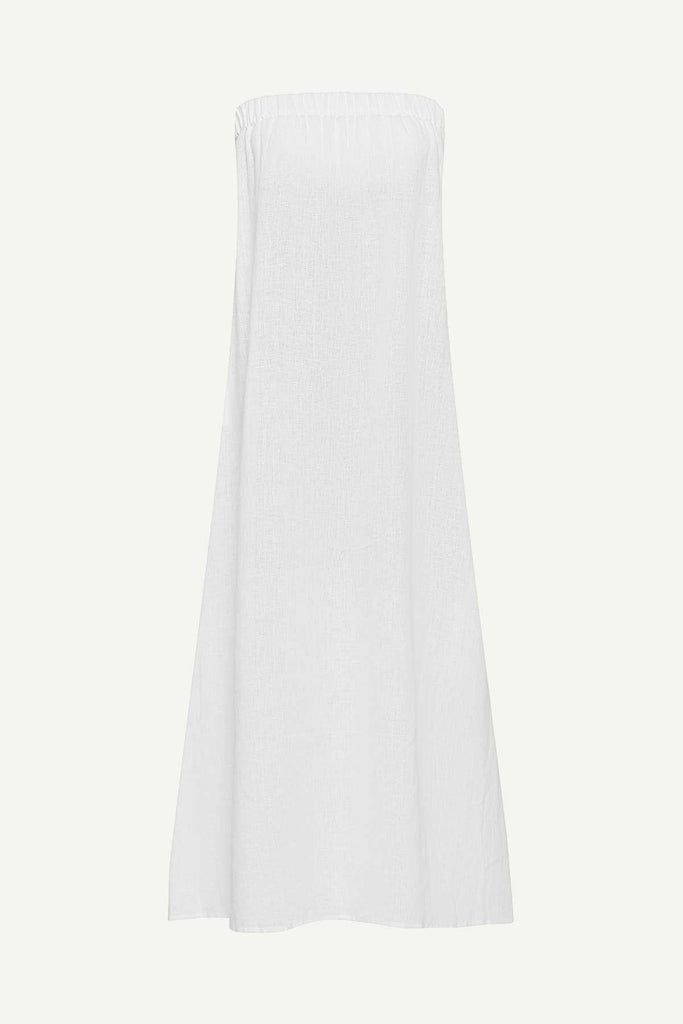 Soleil is an effortless, full length, strapless linen dress that features a wide, elasticated neckline and side seam pockets.