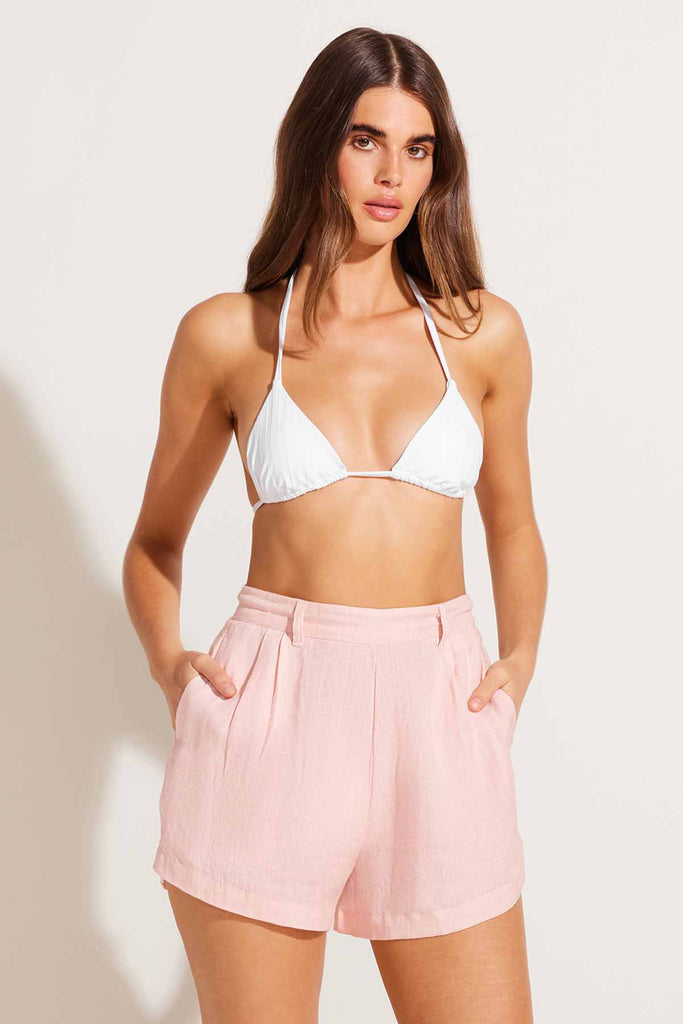 Meet the effortless organic linen shorts. The Getaway Short has an easy fit and flattering front pleats to pair with any suit or top.